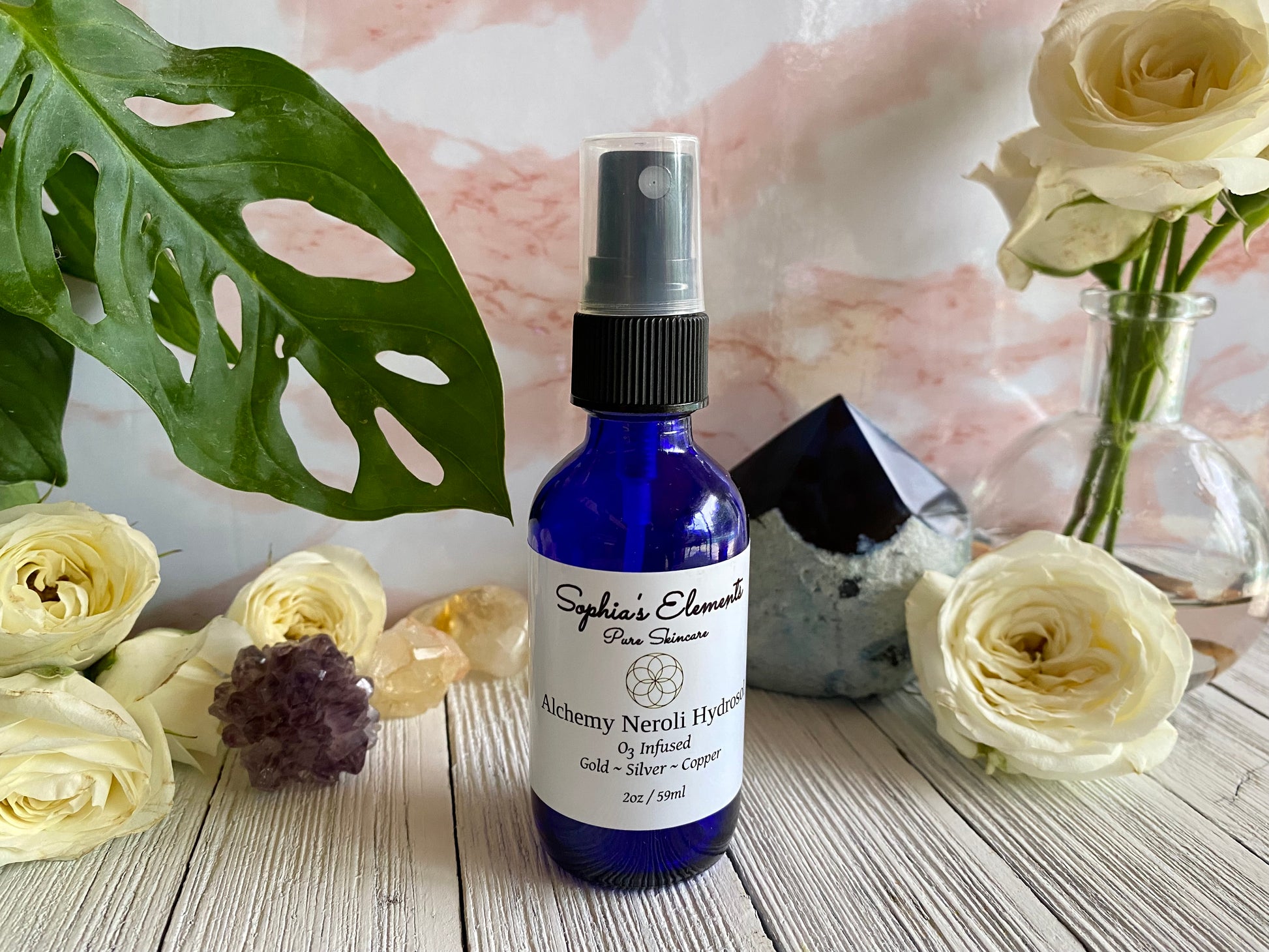 Ingredients: oxygenated neroli hydrosol, silver, gold, & copper colloidal water, organic witch hazel ext, organic neroli essential oil, grapefruit seed ext