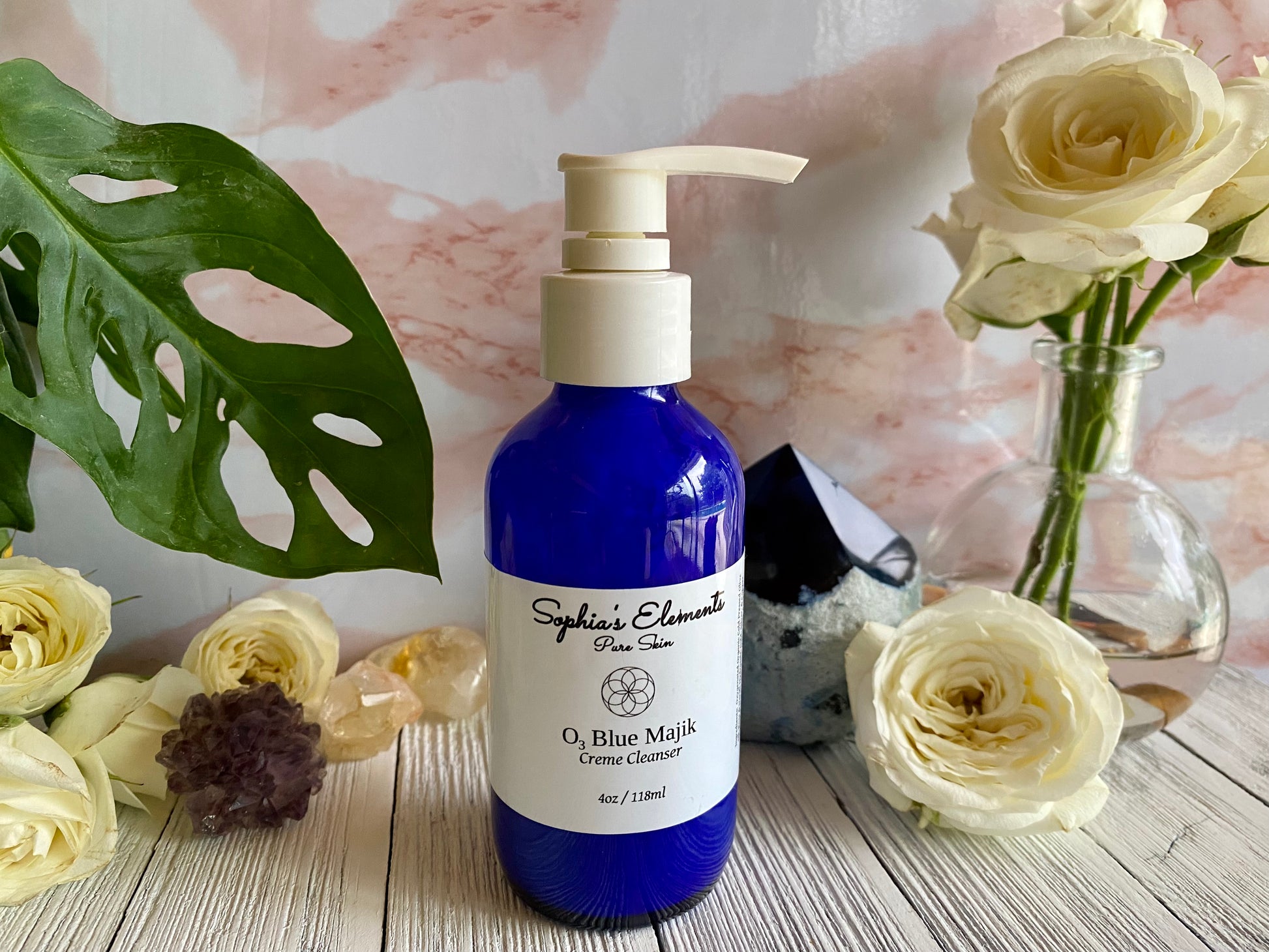 Ingredients: Oxygenated Organic Cold Pressed Olive Oil, Rose and Neroli Hydrosols, Gold, Silver and Copper Colloidal Waters, Squalane (Olive), Konjac Powder, Caprylic Triglyceride MCT, Cocamidopropyl Betaine (Surfactant sourced from Coconut Oil), Leucidal SF Max, Fruit Enzyme Complex, Vegetable Glycerin, Blue Spirulina, Blue Butterfly Flower, Grapefruit Seed Extract, Vitamin E, Essential Oils of Bulgarian Lavender, German Chamomile, Blue Tansy and Yarrow.